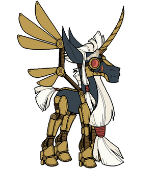 Sprockets is a sentient automaton of Clockwise's design. Using magic and metal, he successfully created a machine capable of independent thought, though he's far from perfect. Sprockets has an extremely limited vocabulary and childish mannerisms and, much like a child, he's very impressionable. He's always learning and picks up bits of everything from everyone he interacts with. As he's still forming basic behaviors, Clockwise prefers he only learns from him, though Whiskey Sour has tried teaching Sprockets curse words. Sprockets is able to perform simple chores and tasks one at a time when instructed, like sweeping or putting things away. He's very curious and eager to please others, especially Clockwise.base- selenaede