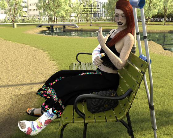 After Jiangshi got home from hospital she decited to paint her casts while try to stay bussy when trying to stop smoking, didnt helped much, but at least she heve nice graphity casts(she is quite artist) After that she went outside to get some fresh air.She is showing you her nice casted toes .