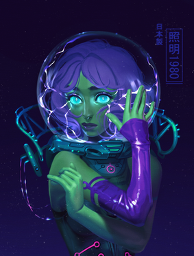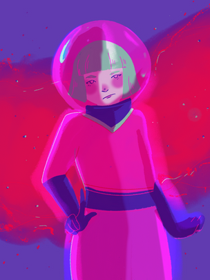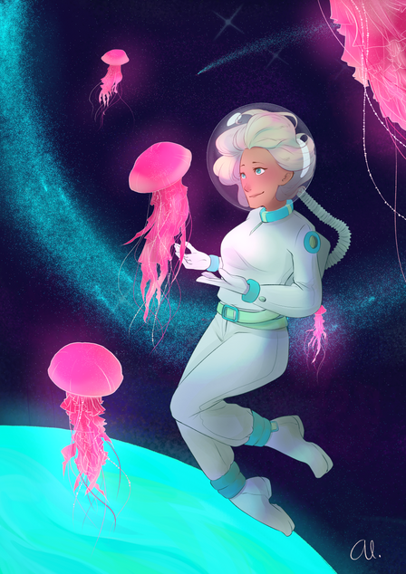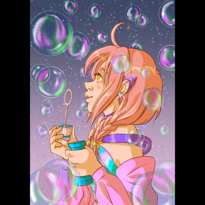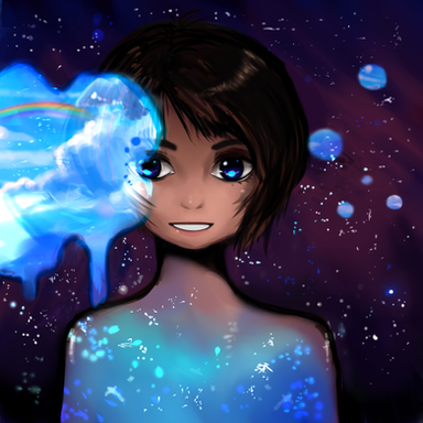 How are made the clouds, the outer space ambient, that shaders with that blurs with the bubbles, and also what story hides about that girl, that the suit is simple but seems beautiful, I wonder if she's nearby to the space and is on a cloud or a nebula cloud already in the space, who knows this girl with a power that we don't know. I love so much.