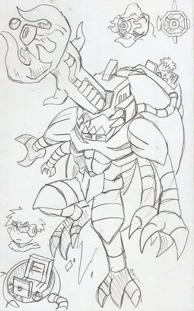 another one of my recent sketches, like how it ended up though the story is kinda hilarious. initially this was supposed to be lord brevons ship, it was pretty bad so I drew a torso while thinking of metal arms: glitch in the system, then after playing spiral knight I went "huh, the morai are nifty" and began drawing organic bits to fit the unseen enemy from that game, then i went "spiral knights is sega, and the attack animations of the meteo-tec scr sereies was neat", and lastly i went "343 industries shouldnt have removed waist armour" and drew a mk v style panel and added it.... maybe it would work in the same world as that vixen character i made.