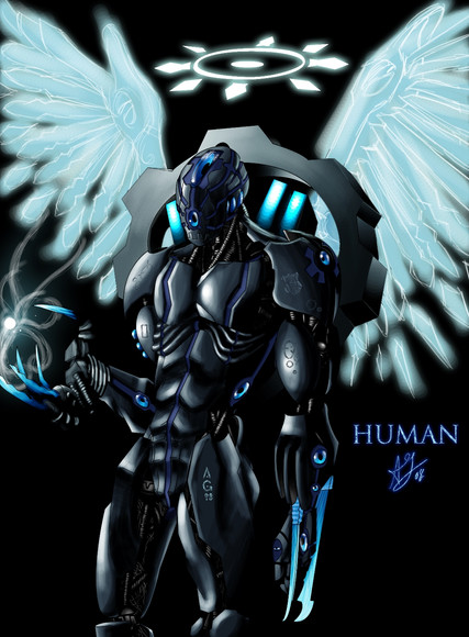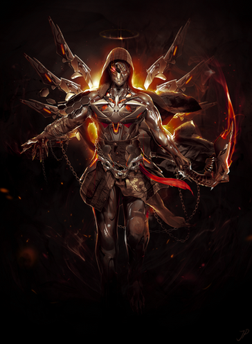 My...God...This is awesome. The use of lighting and coloring makes the guy really pop out, especially since it's the only thing using a colour other than black or light blue. And I like his design (if it IS a he, that is). A cross between mythological imagery and chains, and the cool and sleek technology. Amazing work!