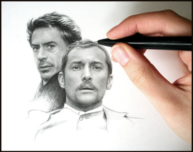 Everything will be in graphite except for his eye and tear (because, in this case, colour represents life which he has given to his characters.)
