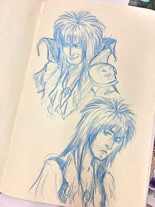 Your linework is very nice. Even though it's not the same perspective as the original Escher room, I think it captures a lot of the same feel of "Where the heck am I?" and actually gets some more depth. Also, the detail work on Jareth's attire and his overall composition is very appealing.