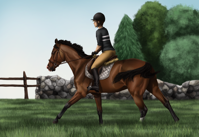 The way you drew the muscles and that shine on her flank, neck and shoulders is so drool worthy! I love seeing horses in motion and you captured that moment perfectly. I still can't stop babbling about the clothing folds on your riders, it just looks so natural and realistic, especially how the green sweater sags at the bottom.