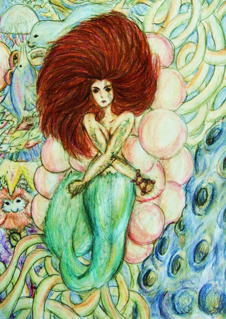 I love the swirling style and coloring, it reminds me of a stained-glass window! And I like the shape of the oyster shells on her top.