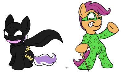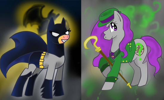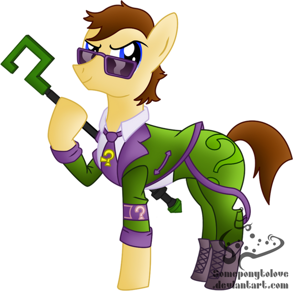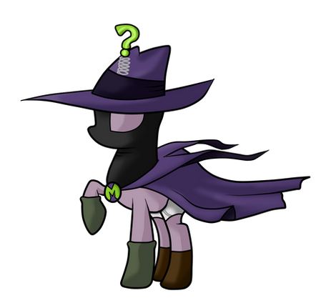 Sketch I drew many months ago that I re-discovered and decided it deserved being coloured. Basically, The Riddler as a pony. Design draws from various different Riddler designs, pretty much just picking what I think looks best. Mostly influenced by the Arkham games though. Thought it was good enough to actually warrant dusting off the dA account.