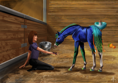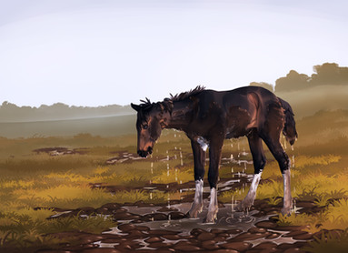 Thumper was getting used to the air around Blue Lagoon. It was soft and there was green everywhere. She was so used to traveling that it still felt a bit unnatural to stay in the same area for longer than a week. The herd had taken Thumper under their wing and she loved it. She was playing with the other foals, getting to know her limits with the horses and eating lots of grass. The people working here were very different than those from the circus. Even though they were always busy, they never pushed Thumper to her limits. They let her go her own way. In the circus she was always forced to follow her mother while she was being trained in the ring. It was very exhausting, but she did learn a lot. One thing she would do every day was show her graceful trot to the other foals. They ignored her most of the time when she did that. One of the things that amazed Thumper the most was the water. She had seen so much, but never water this blue. It almost glowed. Every time when she would drink, she would take a sip and notice that her reflection was staring right back at her. It felt uncomfortable at first, but she got used to it. It almost became comfortable.