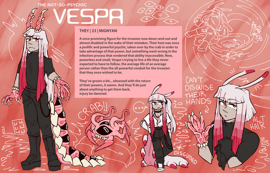 A school project where we designed 3 separate characters.Meph is the protagonist, hence why he has a whole character trait box thing.