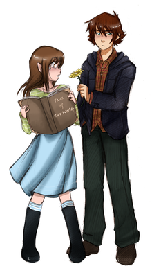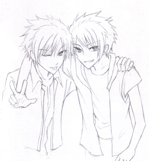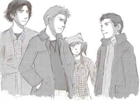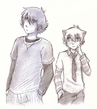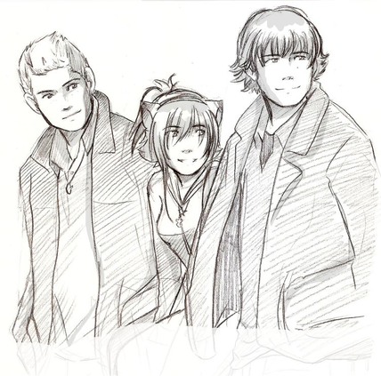 ) Vous faites un clin d'œil symétrique, d'ailleurs, chacune d'un côté ! XD Avec un sourire tout doux.~ Drew a son oreille qui plie sous sa grande casquette, j'aime ce petit détail ! Avec ses cheveux longs relevés qui foncent aux pointes, comme ses oreilles, encore l'une des nombreuses choses que j'aime chez elle. Si elle les laisse détachés, maintenant, ils doivent être vraiment longs, non ? Elle aussi a son symbole sur la casquette, sa petite aile à l'arabesque, et son pendentif ! Et même un peu de Mika sur elle... We are not what you think we are, we are golden, we are golden. Je l'entends juste en regardant le dessin.