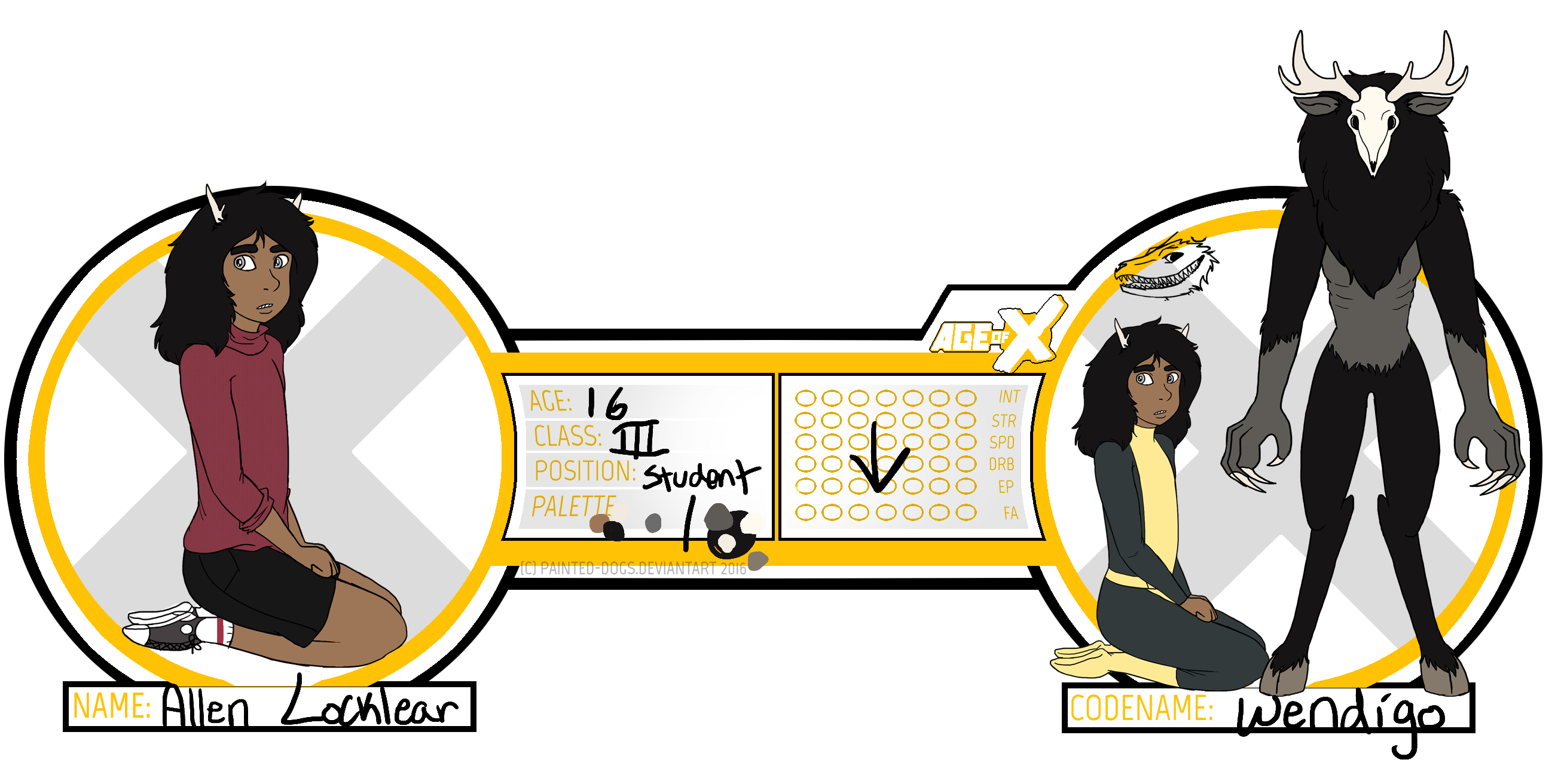Mutation 1: Wendigo Physiology - Similar to the monster of lore, Allen can change into a terrifying beast. This skull head has enhanced strength and speed, but only in this form. His body becomes like a hard shell, making him durable to most physical attacks. He has a keener sense of smell and heightened hearing in this form.