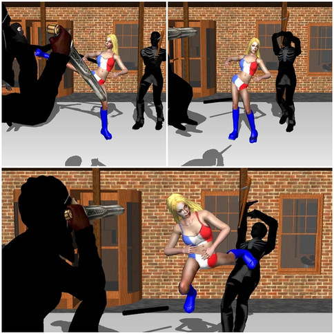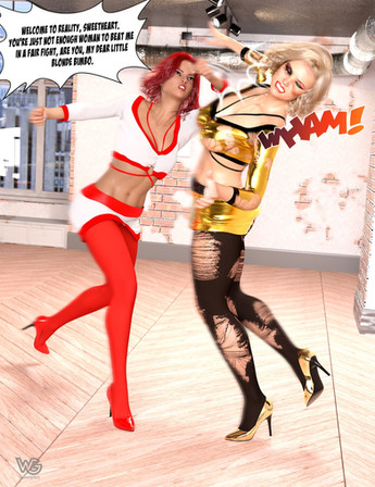 Superheroine Red Rover is shocked that the pudgy malefactor is a great fighter!Related content