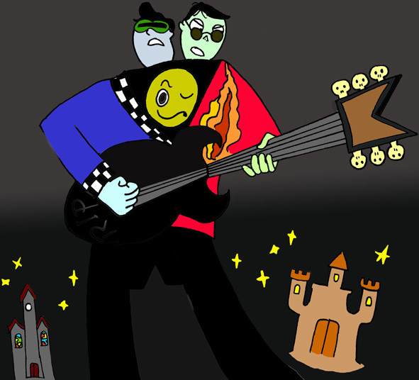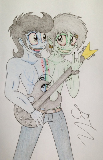 Finally, a decent picture of Frank & Len! This was a hard one to draw for me, mostly because of that guitar and it's weird angle, and holes in the body, and the skull-shaped tuning pegs...and speaking of skulls, anyone else notice that the body of that guitar is actually in the shape of a skull?Time: 4.5-5~ hrs