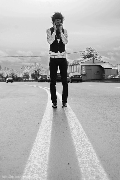 i love this. i love the contrast. i love how he's framed in comparison to the cars to the left with the road that stretches beyond him. i also oddly adore his legs. looks as though he has left some important event that went wrong (or, who knows, maybe he just dresses awesome). looking at this makes me question what his story is & why he feels this way. it's easy to relate to. i think that's why i love this so much.