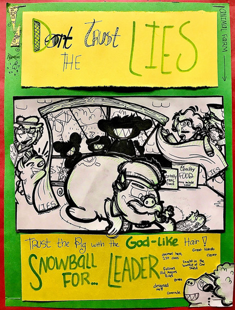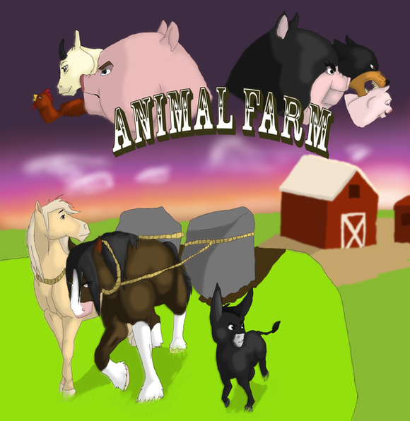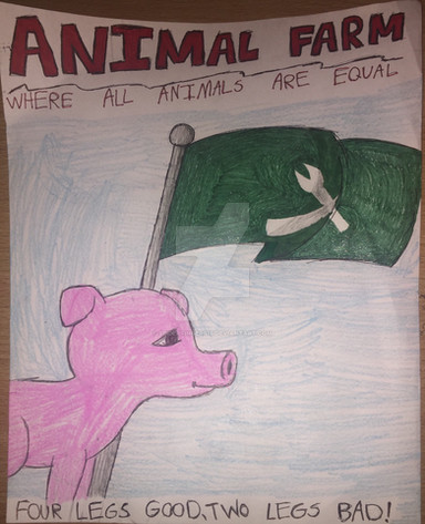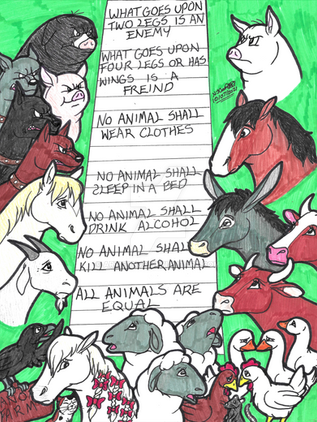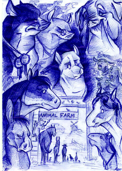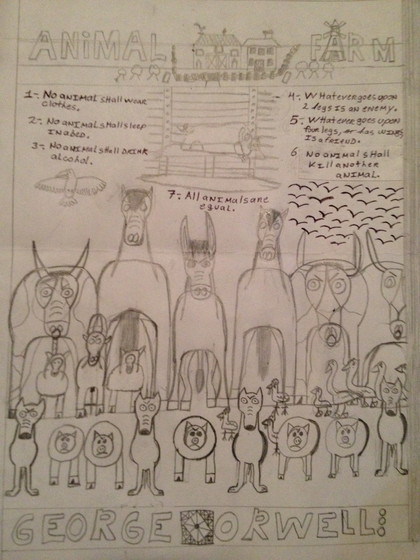 I found really old art! Circa 2000.In 8th grade we read Animal Farm, and my friend and I took an assignment to illustrate 10-12 key scenes of the book. I drew, and my friend did the wording (because my handwriting has always been awful--my mother used to threaten me with lessons). My teacher's comments are next to most of our headings cuz apparently we were supposed to explain things as well as label them. Chya. We got 23/25 for this.