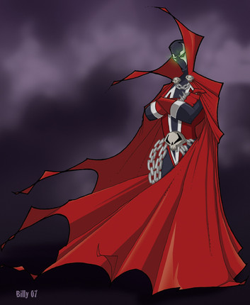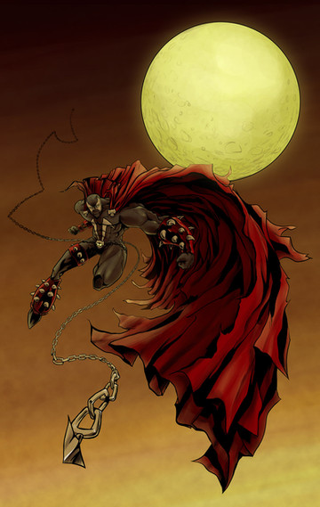 Spawn. Popular character created by Todd MacFarlane. Pictured here diving on the spotlight with the Batman symbol on it (out of shot). Wow, am I ever drunk.Related content