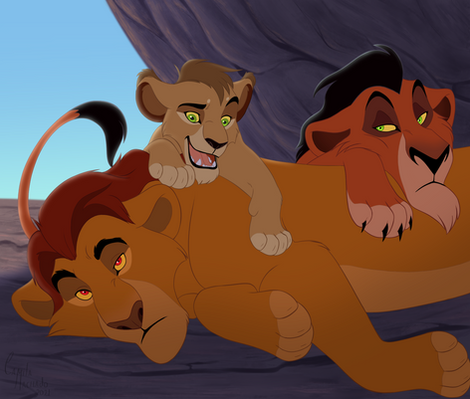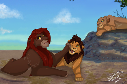 some cutesy TLK art to round out the year, like a lot of what i drew this year, featuring a not so sneaky simba lol. i dont have a fleshed out concept for Mheetu, just the standard 'scar and sarafinas son'. i assume he chooses to live in a neighboring pride as an adult, partially to not live under his fathers shadow. but he visits often and is close with his niece and nephew. he was probably a tween when his half brother nuka was born. they werent close