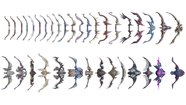 The fourth and final set (the bluish ones with counterparts that are split into pieces) are the Ultima Series. Each weapon is split into 5 pieces and are scattered around the world.