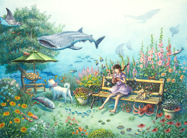 The picture really looks great. I think it reflects the troposes sometimes exotic waters well properly. The animals are all the size and impressive, they have many body details and their surface let you look like sea animals. Also, the different variants thereof and design can see it class it looks so much and with a lot of motion. The colors are strong and satisfied and leaves the sea rightfully live. And everything in relation to the girl from the size makes the picture become whole and great. Good work.