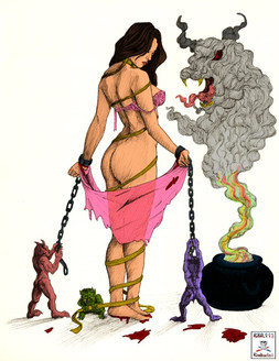 I took a print out of the lines and used that to do my base color work by hand and then scanned it back in. Using Paint.net software I edited down the flats to a single frame, removed the background color, and made the spiral backdrop. I then added my work on top of the spiral and lined up the green globes. Then I added a third layer of my work but inverted it and removed everything but the goblins so that the labyrinth in his coat and the spiral above her head gave the illusion of perpetual chaos an motion yet never reaching the goal. I added the scan of an old file folder as a back ground and then added my skull tag and and a tag for and also.