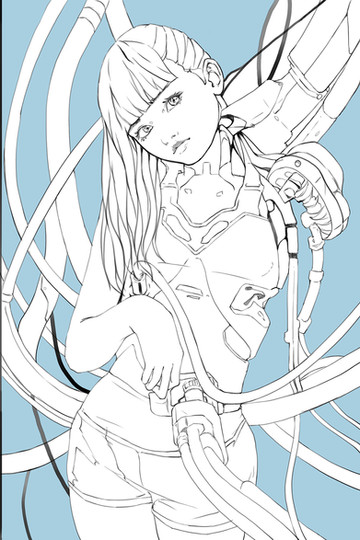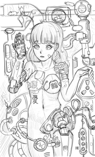 Only the curved boxes surrounding her. The rest is done by hand. I didn't have my flexi-curve with me. It is buried somewhere in storage. I plan to get it sometime in the next few weeks.
