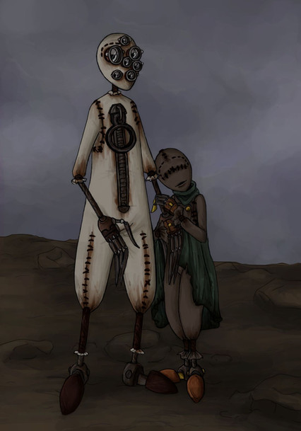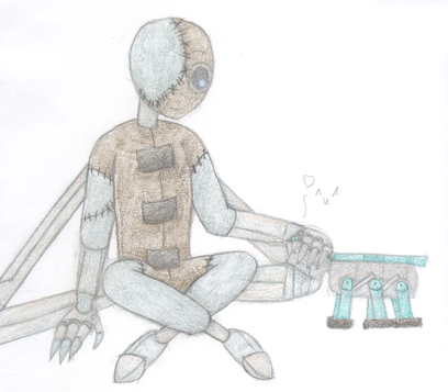 However, in that moment, the young stitchpunk didn't mind one bit. Ever since the souls of his now-returned friends sent small, gentle drops from the sky for the first time in over a decade, 9 found himself quite fond of rainstorms. He could watch the landscape for hours, sheets of silver velvet falling in heavy downpours, or in soft threads. This morning, he'd ventured into the soon-to-be watchtower, quietly watching. His hearing sensors picked up the gentle percussion of the rain as it pattered against the overhang and outer rim of the platform. The soothing noise rapped in an erratic rhythm, but 9 found himself tapping the tips of his fingers against his zipper, putting a tune to the song of the storm.
