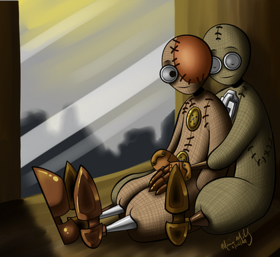 Much to both his relief and delight, 7's lips curved into a smile and parted into a small, light laugh. He joined in before untangling his fingers from hers to instead envelope her slender body in his long, lanky arms. He held her close to his heart, briefly marveling how someone who appeared delicate and fragile was solid and strong. A bit like the rain around them, he mused. The stalwart warrior met his familiar touch with a tender nuzzle against his shoulder. 9 closed his eyes as she settled against him. The faint, but sure beats of her heart thrummed in time to the rain. Another roil of thunder ambled across the sky, nearly sounding like a heartbeat itself. But this time, both ragdolls remained still, except for the male pressing a warm kiss to her shoulder. They remained together in this small, intimate moment of bliss. The rainstorm became a backdrop to their small, but sure, celebration of life.