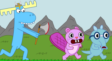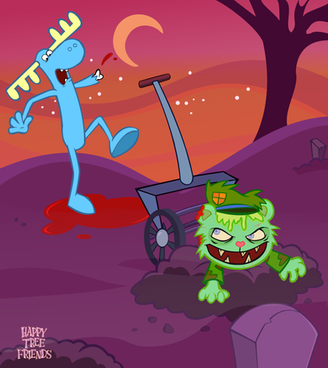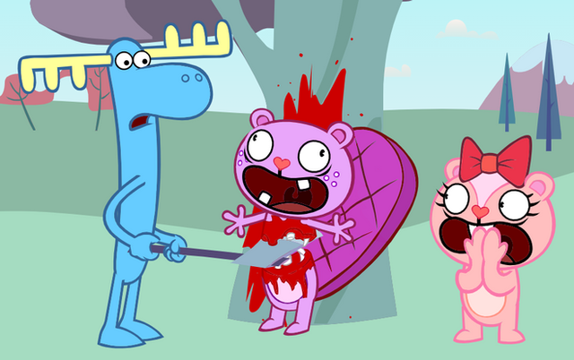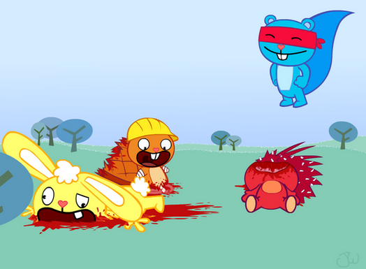 flaky is just thinking (oh shit) and lumpy doesnt give a fuck that his pet just killed a bunch of animals