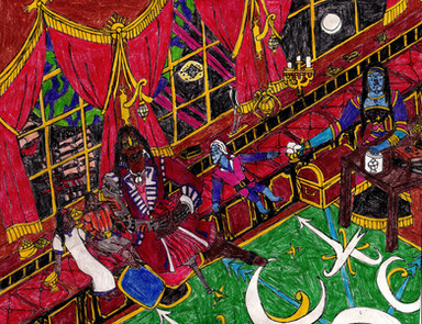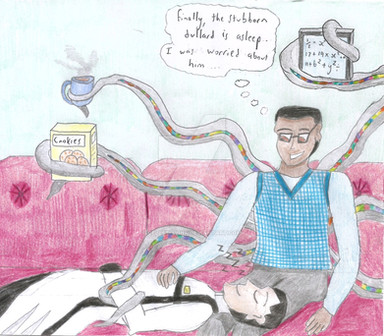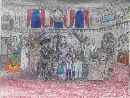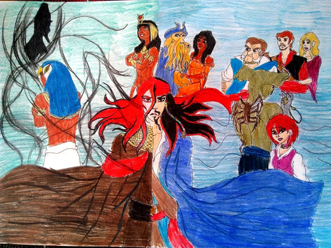 The couple kissing in the centre is Morticia and Gomez Addams (from the Addams Family). They are seriously one of the best romantic couples and I'm super happy over the way this turned out. The arms, the body positions . . . It took so long, but completely worth the result.