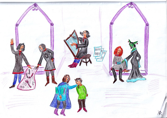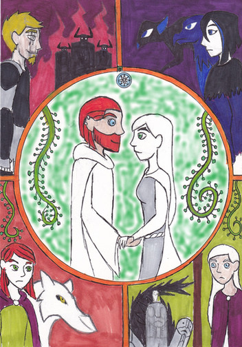 Kili and Tauriel (from the Hobbit films) are holding hands in he front, by the pottery. It's been ages since I drew them, but I haven't forgotten, and it was nice to bring some new skills that I've learnt to those characters.