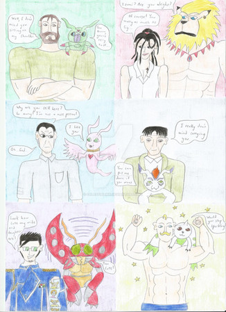 I'm really happy with the way this turned out, though the thought bubbles with Greed and Ling didn't so too well. I tried to make their outfits look Xingese (Ling is wearing yellow and black because they are apparently the colours of the Emperor, and Lan Fan is wearing black and silver, since Winry insisted that it would look good with her automail.) And you just know that Greed learnt to dance so that he could gate crash fancy parties and pick up girls . . .