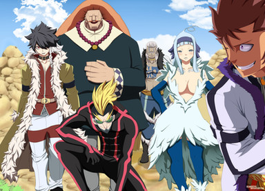You see the guild masters Makarov Dreyar from Fairy Tail, Sting Eucliffe from Sabertooth, Ooba Babasama from Lamia Scale, Bob from Blue Pegasus, Goldmine from Quattro Cerberus and... Mavis Vermillion... She just sneaked into the picture... xD
