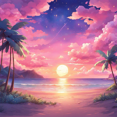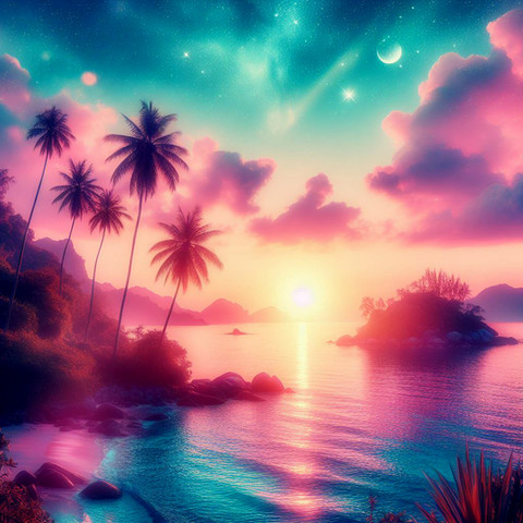 Prompt:Β ocean, stars, moon, calm, birds, palm trees, beach, reflections, water tides, 8k, highest resolution, masterpiece, sunset, ocean tides