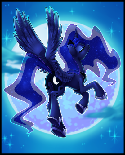 I've always loved night time illustrations. Less color and light to work with....which in other ways can also be a minus. But the culmination of boues and purplesis fabulous, especially when tied with the hint of gold or green in the ponies eyes. Love the design on the inner wing. Reminds me of butterflies.