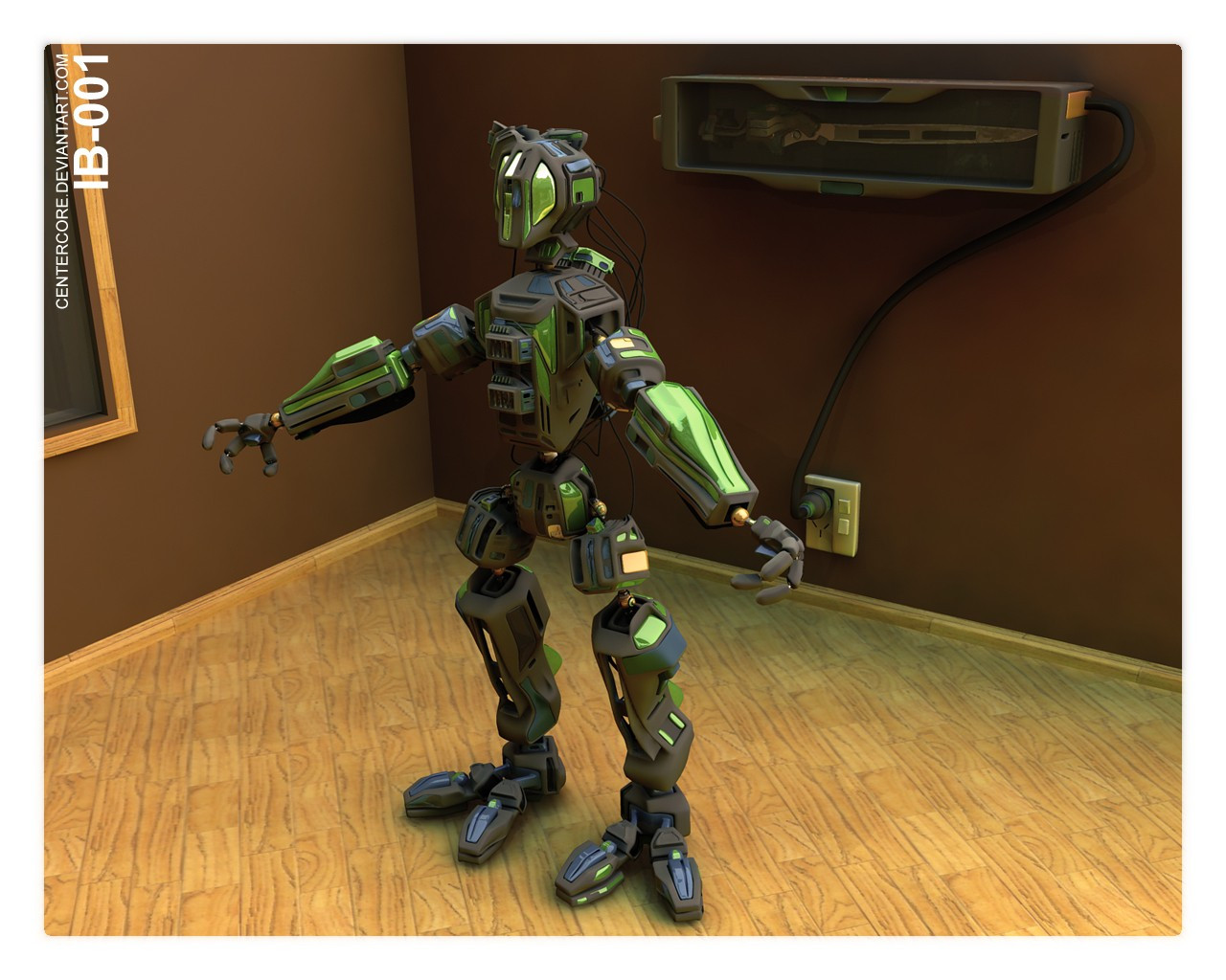 This one exceeded 50 thousand polygons un-nurbed half way through the project I can only imagine what the number is now maybe three times as much. Most of the bot is detailed front back right side and left and top and bottomAnyway Im quite happy with this one, I didnt want to make the enviroment the same as my last two so I added a window and a sword display/storage cabinet.