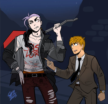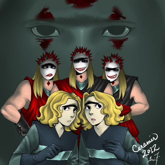 Something I doodled out when I was on my lunch break. I noticed that I usually draw the twins being all cutesy 'n such, but I hardly ever draw them as their mischevious and meddling selves. Based off the dream machine episode. Painted in SAI.Art by me.