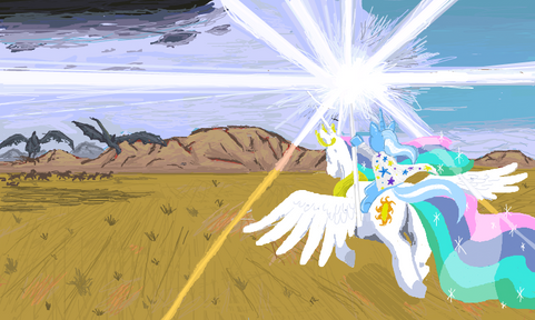 Quick pan to Canterlot: As Princess Celestia is having a meeting with other royalty she feels a sudden jolt in her brain. Her pupils narrow in shock. “No!”