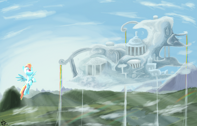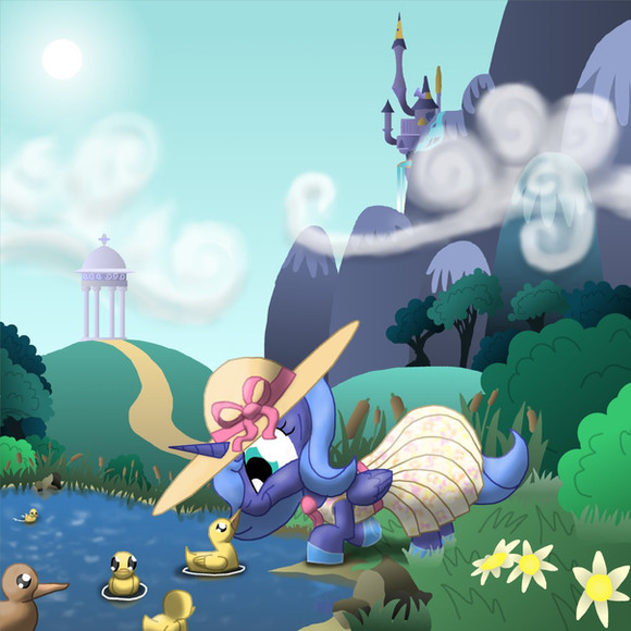 She slowly stands up on all fours and stays still. She listens to the wind and the birds chirping, and she looks around. Everything is so colorful. The mountains piercing the sky, one of them adorned with Canterlot. And everything is so warm.