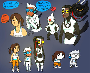 the short one is a boy the long one is a girl (atlas and p-body) Β everybody beieves that so does me and my sister but what the heck other then that small mistake the art is amazing p.s i love that somebody has diced to make glados something different for once