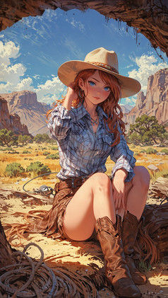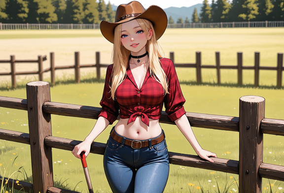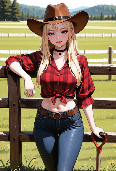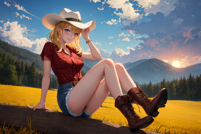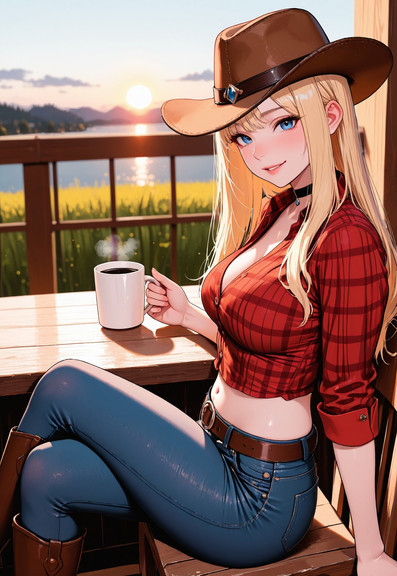 #fanart #digitalart #anime #animegirl #characterdesign #western #digitalpainting #blonde #choker #coffee #cowgirl #hat #jeans #sunrise #wallpaper
