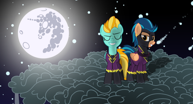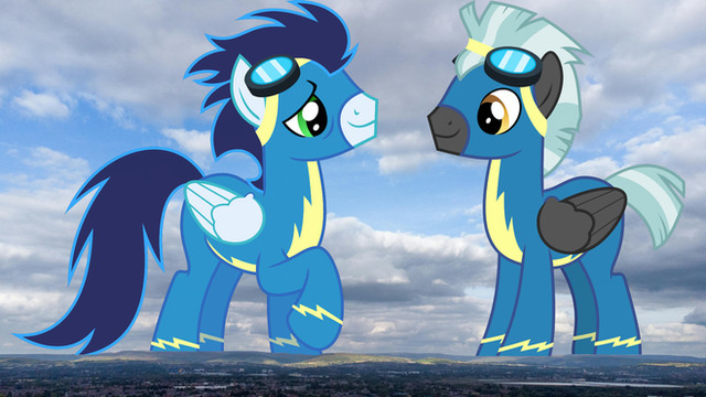 So, I thought I'd try something different by doing art unrelated to Doctor Who whatsoever of these two with this. I've only vectored these two once or twice in the past for another project, and grouped them with two of my other favorite background pegasus stallions, though this is the first time I pair them explicitly together. I'm not good with complicated effects so it's just the two vectors I did a couple days ago recolored into them, with a background thrown in and a trick with the cutie marks from the Season 3 premiere