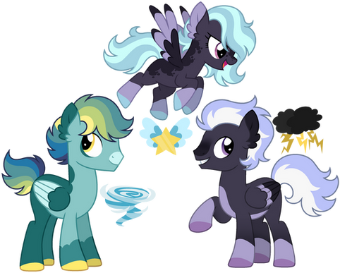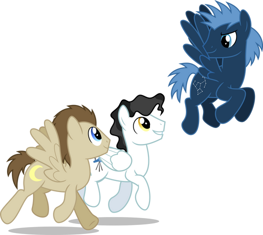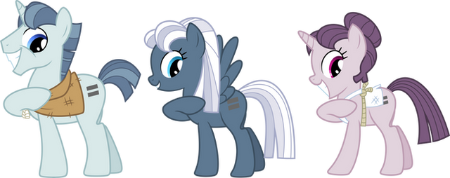 Featuring Neon Lights (unicorn), Sir Pony Moore / Bruce Mane (earth pony), and Twilight Sky (pegasus), all of which have identical cutie marks. The coats of Neon and Sir Pony Moore aren't identical by give or take 5 RGBs, the latter of which also appears consistently in the show with a brighter tail than mane. I threw in Twilight Sky to make it a group of three ponies despite his distinguishable color scheme, but also to make this a group of an earth pony, a pegasus, and a unicorn. I think he has a pretty sick design and is only one of three pegasi I know of with it.*