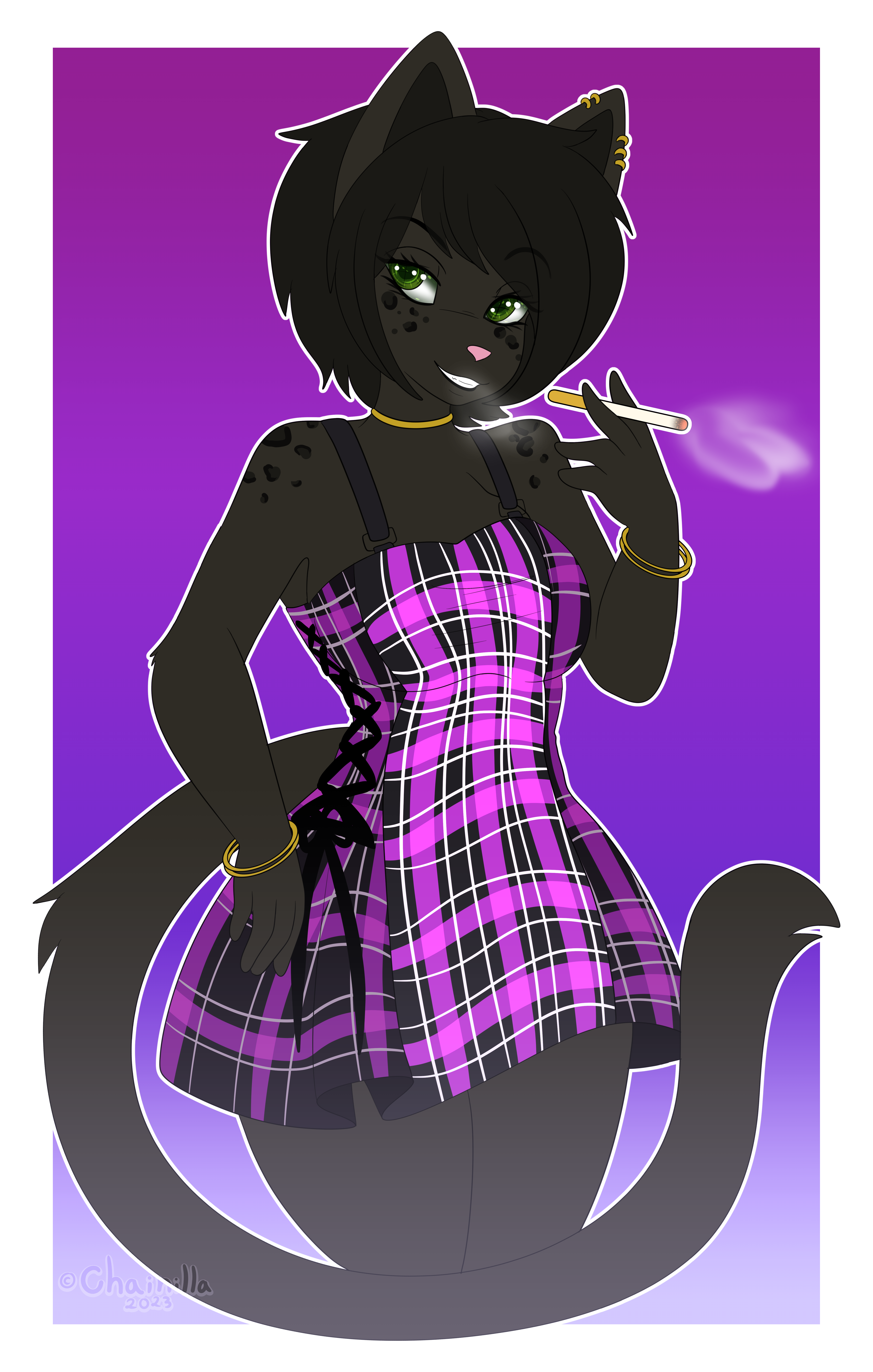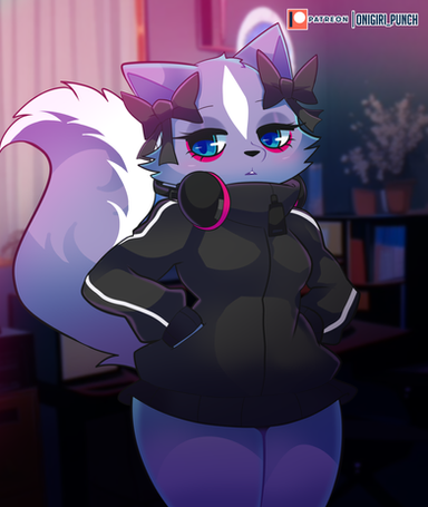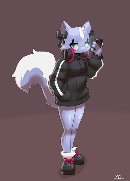#anthro #digitalart #digitalartist #female #furry #furryanthro #furryart #headphones #skunk #black_shoes #shikabane #long_tail #fluffy_tail #female_solo #purple_fur #furryartist #big_sweater #hair_bows #aggretsuko #track_sweater