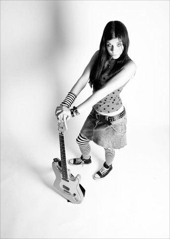 i think the light colored guitar really makes the stripes in her socks stand out, but that's just my opinion and it looks awesome~
