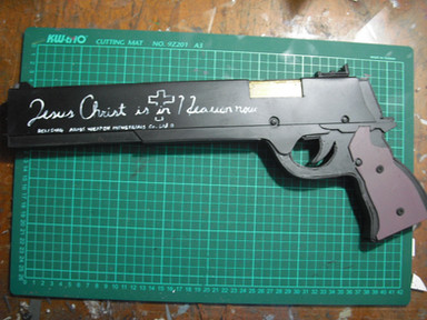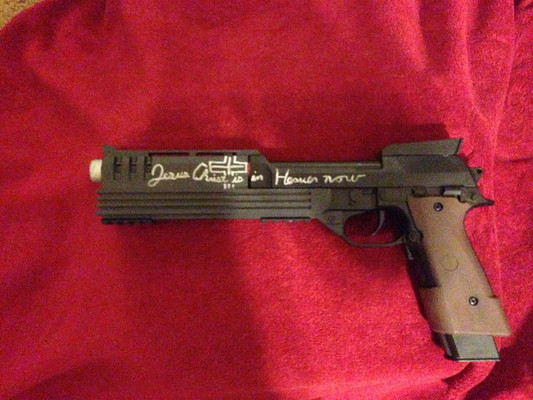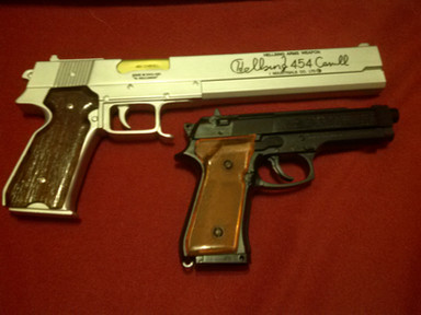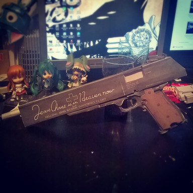 Allrighty. This is the most expensive purchase I have ever made. It is the resin replica gun set from HellSing. It came with Jackal, Casull, two stands and a two-disc full episode DVD set. Very wonderful. They are in wonderful detail, and very heavy.I lurve them so much...