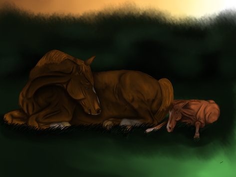 The mare on the right was done in a similar manner, though once I was done with her basic brown colour and shading, I duplicated that layer, darkened it, and erased and blended it into the lower one. Rinse and repeat until the horse looks like I want it to