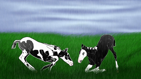 I use Artrage 4, and for the stallion on the left I used a base pallet of two colours for the black coat, and two colours for mane and tell, as well as two colours for the white, in addition to a few colours here and there for his nostrils, eyes and the pink of his lighter skin and hooves. After the base layer went on, the second, darker colour went on for shading on an upper layer. Then parts of the darker layer were smudged and blended. This was repeated for every section that required different colours. Afterwards, I simply adjusted their hues, brightness and sat. through the colour slider until.. Boom. The horse was done.