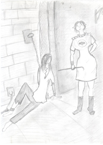 Amy is carrying a rubber whip. It's standard issue to all employees of the complex. Having been a prisoner for seventy-nine months there, she suffered more than a few whippings across her back, her breasts, her buttocks, her thighs, etc. Not surprisingly, she didn't enjoy this extra attention, so she wouldn't think of using it on Amy 2. It does make a good pointer, fly swatter, door opener, not to mention the playful pokes she occasionally gives Amy 2 when she gets too engrossed in her work.