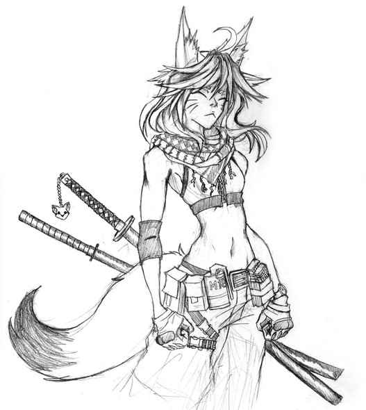 Yup that tacticool train continues onward! I actually wanted to draw her with her rifle. I mean platform. Obviously. I hadn't found a good pose for it so far. I've said this before, drawing guns is hard. Its really easy to have them come out looking bendy. I like the level of "stuff" just straight up gear I can strap on to her, but I think I can do more. I dunno I think that figuring out and just loading her up with gear is tons of fun a good exercise. Its difficult. Like I couldnt figure out where to strap on her katanas on this drawing and have it look good. One day I'll figure out how to cram swords, her small guns, and her assault rifle all in one shot.Also follow me onΒ Twitter .Β