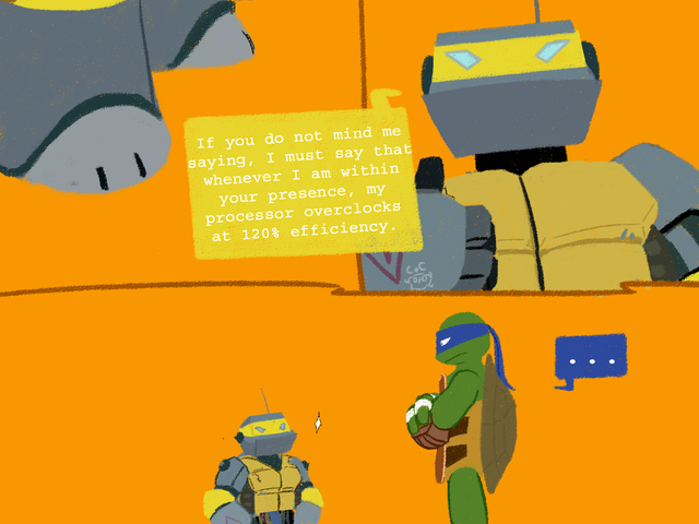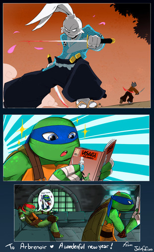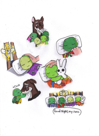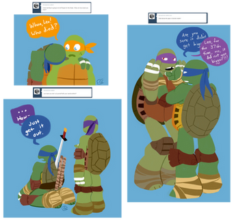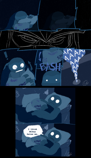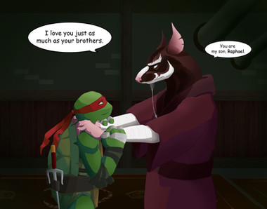 Leo felt a lot better after talking with Master Splinter about SOME of his troubles and was able to sleep with Captain Ryan protecting his dreams from Shredder. XDActually there was supposed to be one more nightmare sequence and it was more extreme than the other ones, but Leo got all better before I could draw it. Maybe I'll try it later, since I really liked how I planned it.