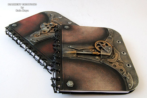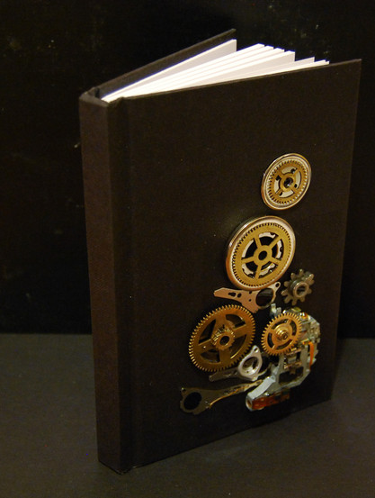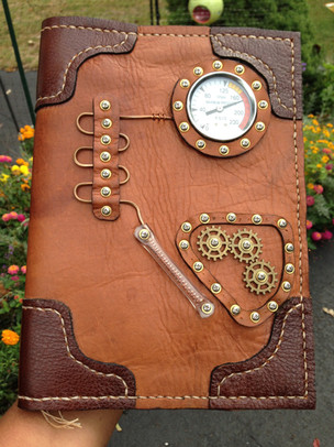 The details on this are beautiful. I love the dark leather. and I really like the metal plates in the corners of the book. I think it makes it look complete, instead of just looking like the gears in the middle are just stuck on.